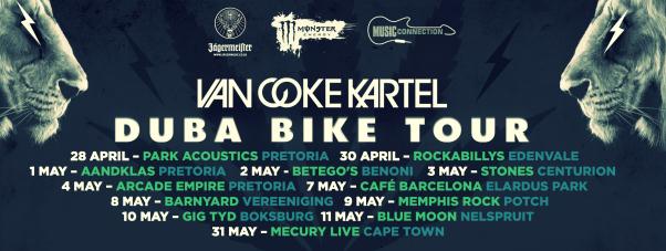 More great news is that Van Coke Kartel will be kicking of a 12 date national tour at the end of April 2013. The Jägermeister, Monster Energy and Music Connection Duba Bike Tour starts off in Pretoria on the 28th of April and ends in Cape Town on the 31st of May 2013. Make your way to one of these gigs, you will not be disappointed